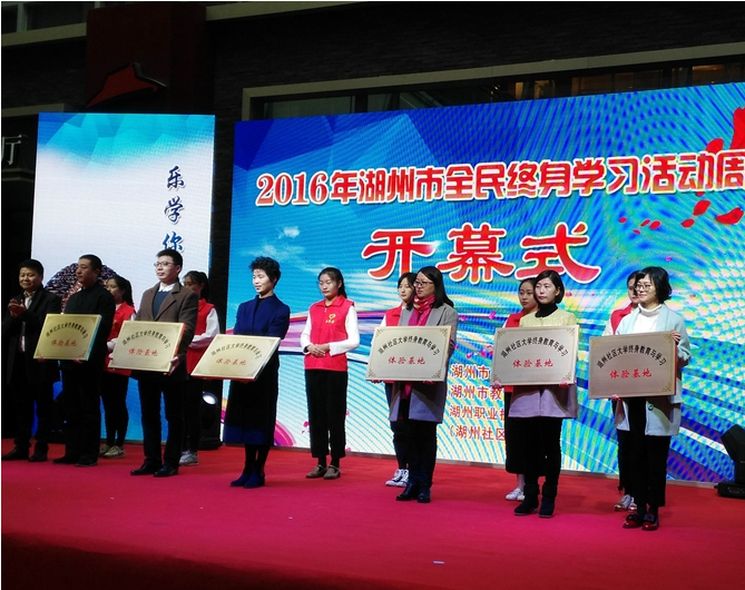 2016年湖州市全民终身学习活动周由市委宣传部主办,市教育局、我校(湖州社区大学)共同承办。各县(区)教育局分管领导、职能科室负责人,吴兴区、南浔区各乡镇(街道)分管领导,各县(区)社区学院、乡镇(街道)社区教育中心、湖州社区大学终身教育与学习体验基地合作单位负责人和企业分校负责人、各演出单位演职人员、各获奖代表、新闻媒体记者及市民代表等近300人参加了活动。