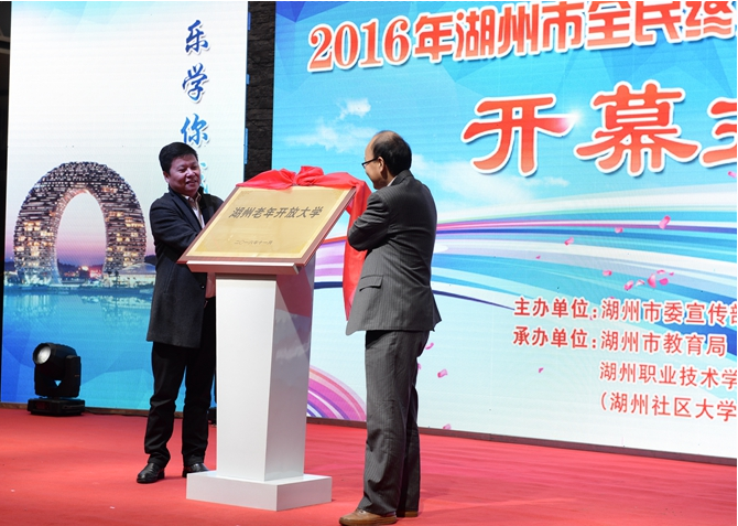 方新旗宣布2016年湖州市终身学习活动周开幕。眭宝良与周家健共同为湖州老年开放大学揭牌,周家健为湖州社区大学首批六家终身教育与学习体验基地合作单位授牌。开幕式上,2016年湖州市“百姓学习之星”、“终身学习品牌项目”、中老年书画摄影大赛等各类获奖代表分别获得表彰。市民代表、2016年湖州市“百姓学习之星”厉奇山宣读《终身学习倡议书》,向全体市民发出“全民学习、终身学习”的倡议。