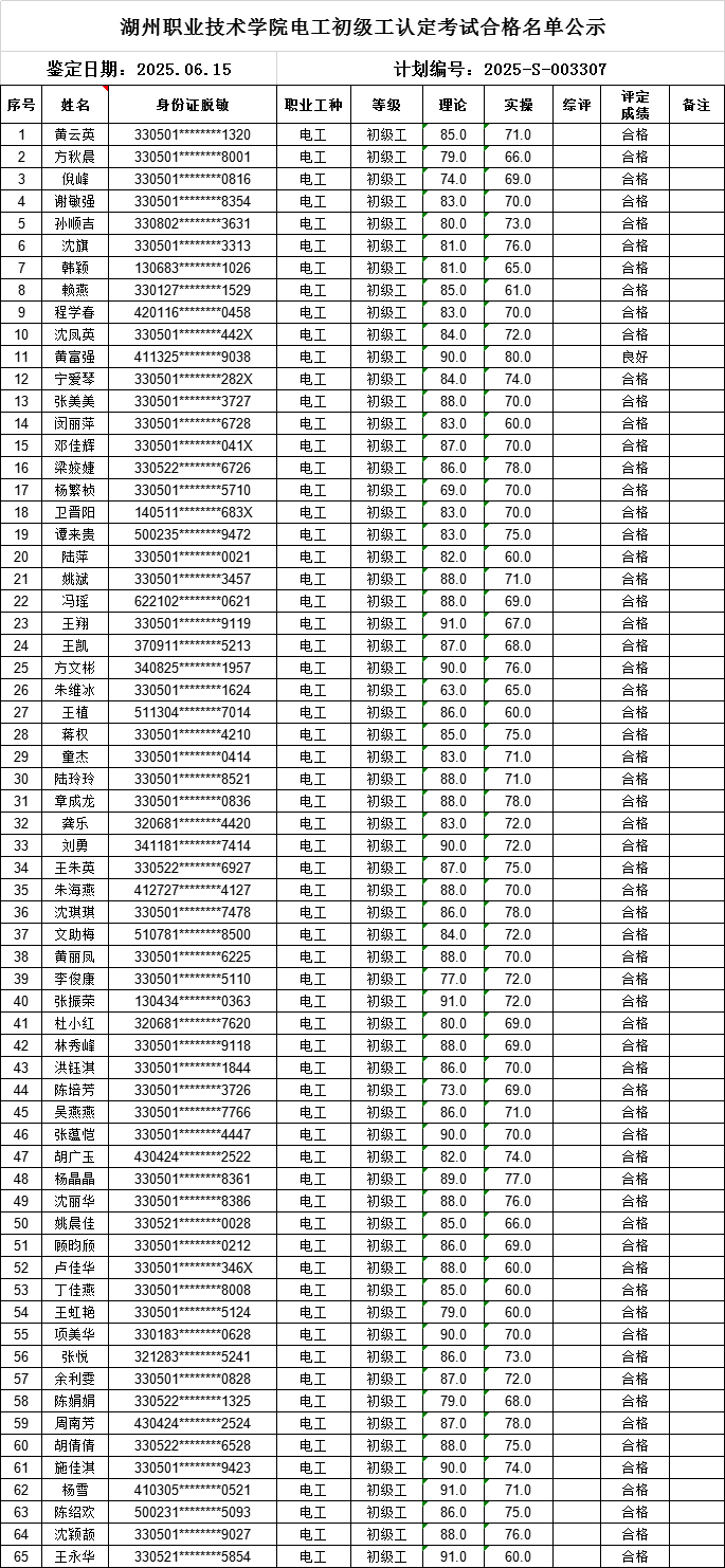 2025年度6月份电工初级工技能等级认定工作已经结束(认定批次:2025-S-003307),根据《湖州职业技术学院技能等级认定管理制度》,现将参加考核合格人员成绩予以公示,具体如下: