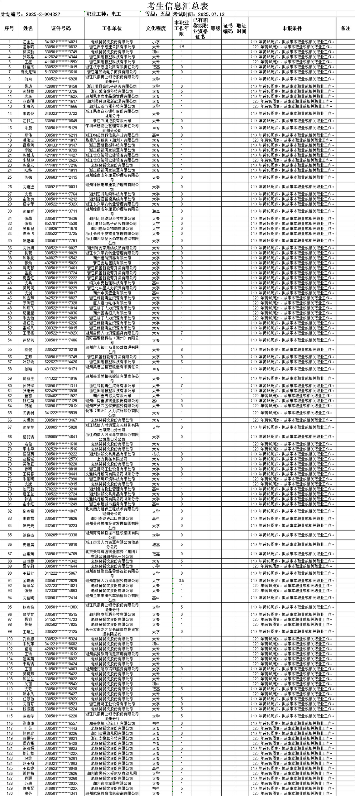 根据《湖州职业技术学院职业技能等级认定计划公告(2025年度)》,经研究决定于2025年7月开展电工初级工职业技能等级认定,现公告如下: