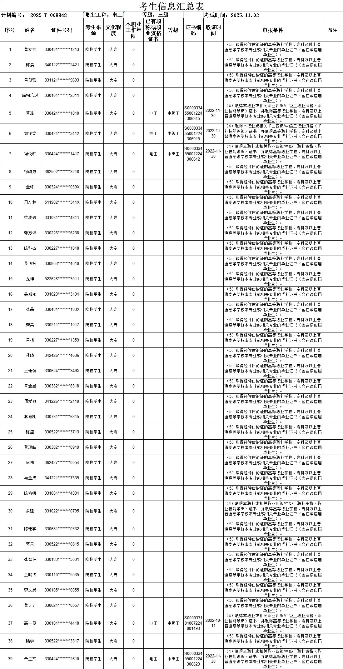 根据《湖州职业技术学院职业技能等级认定计划公告(2025年度)》,经研究决定于2025年11月开展电工高级工职业技能等级认定,现公告如下: