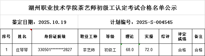 2025年度10月份茶艺师初级工职业技能等级认定工作已经结束(认定批次:2025-S-004545),根据《湖州职业技术学院技能等级认定管理制度》,现将参加考核合格人员成绩予以公示,具体如下: