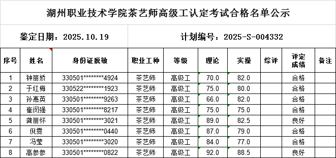 2025年度10月份茶艺师高级工职业技能等级认定工作已经结束(认定批次:2025-S-004332),根据《湖州职业技术学院技能等级认定管理制度》,现将参加考核合格人员成绩予以公示,具体如下: