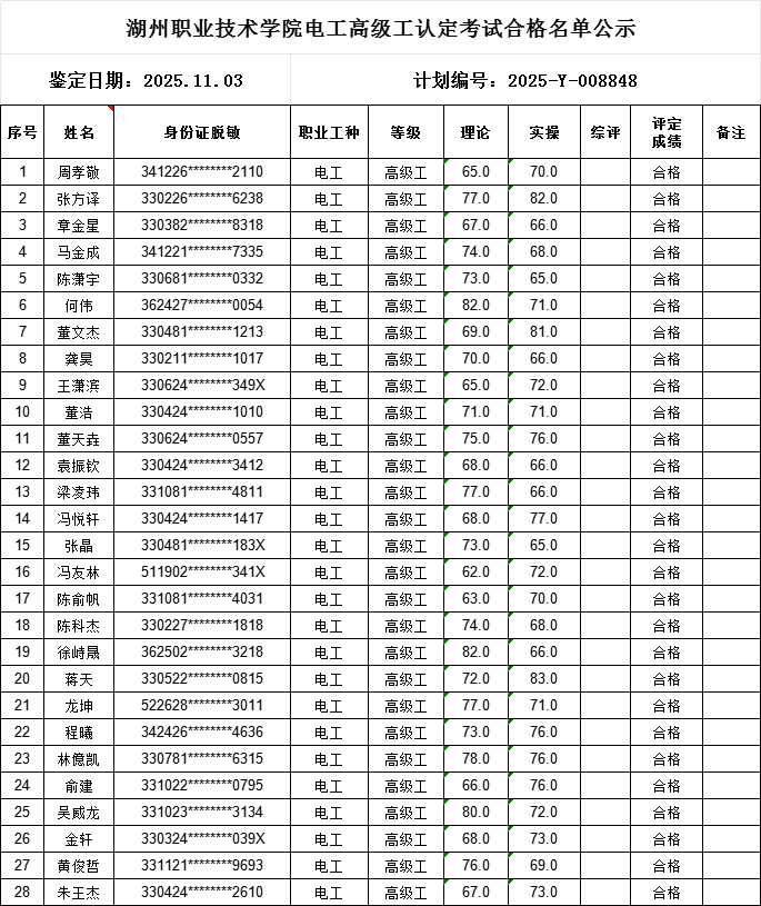 2025年度11月份电工高级工职业技能等级认定工作已经结束(认定批次:2025-Y-008848),根据《湖州职业技术学院技能等级认定管理制度》,现将参加考核合格人员成绩予以公示,具体如下: