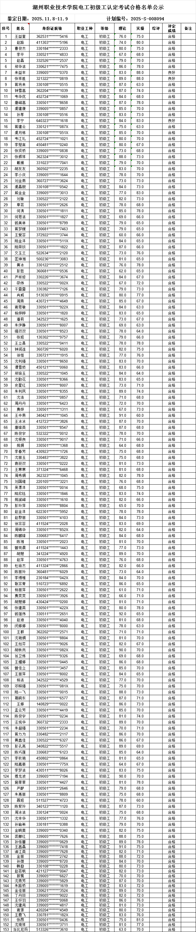 2025年度11月份电工初级工职业技能等级认定工作已经结束(认定批次:2025-S-008094),根据《湖州职业技术学院技能等级认定管理制度》,现将参加考核合格人员成绩予以公示,具体如下: