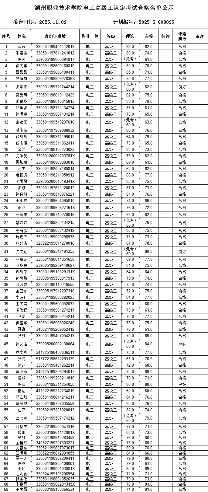 批次:2025-S-008095),根据《湖州职业技术学院技能等级认定管理制度》,现将参加考核合格人员成绩予以公示,具体如下: