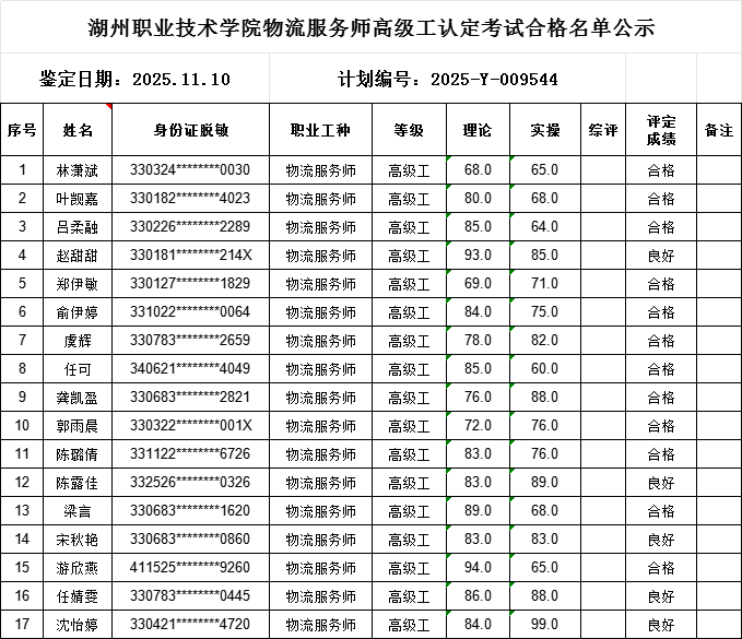 2025年度11月份物流服务师高级工职业技能等级认定工作已经结束(认定批次:2025-Y-009544),根据《湖州职业技术学院技能等级认定管理制度》,现将参加考核合格人员成绩予以公示,具体如下:
