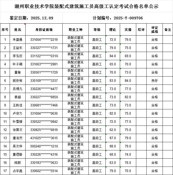 2025年度12月份装配式建筑施工员高级工职业技能等级认定工作已经结束(认定批次:2025-Y-009706),根据《湖州职业技术学院技能等级认定管理制度》,现将参加考核合格人员成绩予以公示,具体如下: