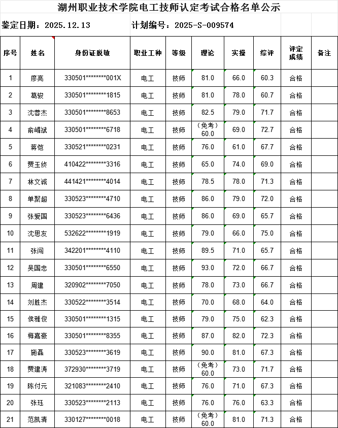 2025年度12月份电工技师职业技能等级认定工作已经结束(认定批次:2025-S-009574),根据《湖州职业技术学院技能等级认定管理制度》,现将参加考核合格人员成绩予以公示,具体如下:
