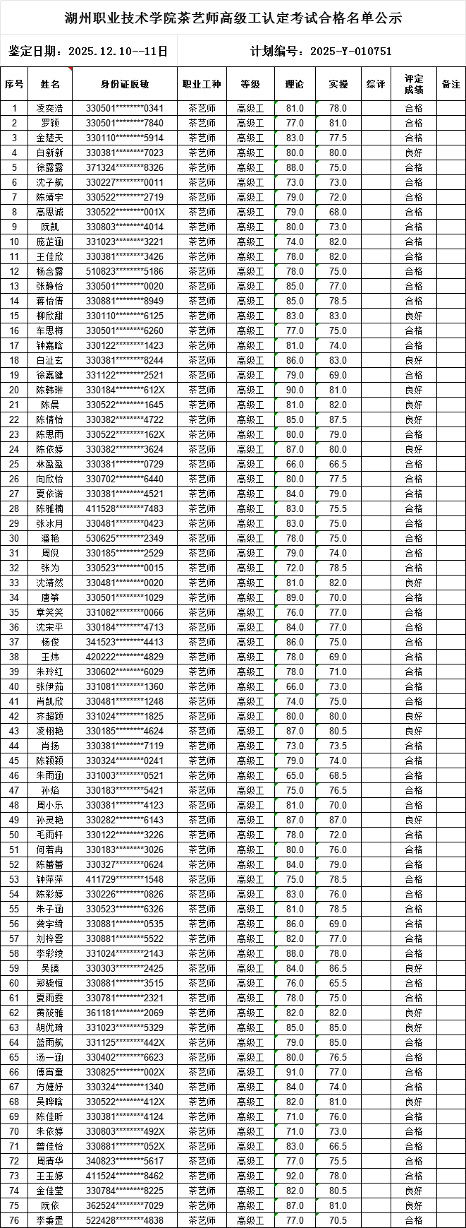 2025年度12月份茶艺师高级工职业技能等级认定工作已经结束(认定批次:2025-Y-010751),根据《湖州职业技术学院技能等级认定管理制度》,现将参加考核合格人员成绩予以公示,具体如下: