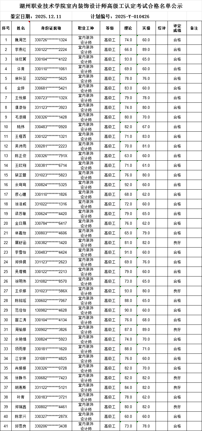 2025年度12月份室内装饰设计师高级工职业技能等级认定工作已经结束(认定批次:2025-Y-010426),根据《湖州职业技术学院技能等级认定管理制度》,现将参加考核合格人员成绩予以公示,具体如下: