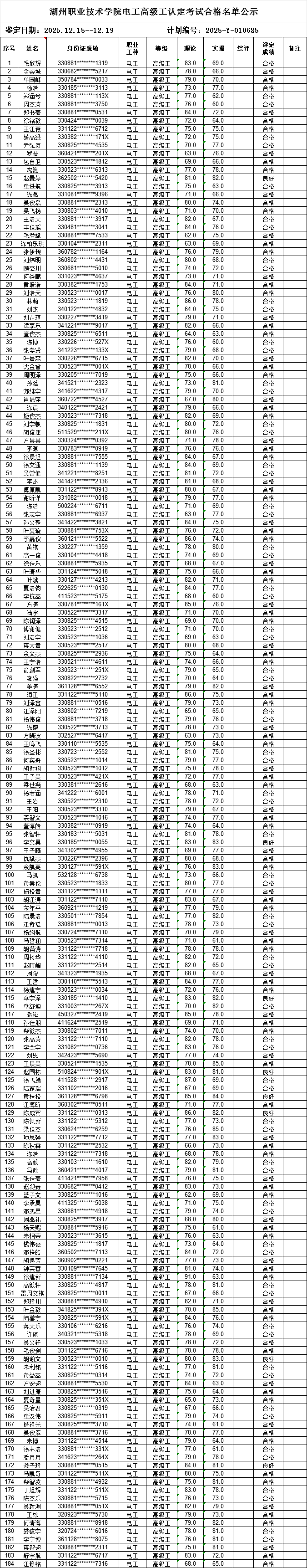2025年度12月份电工高级工职业技能等级认定工作已经结束(认定批次:2025-Y-010685,根据《湖州职业技术学院技能等级认定管理制度》,现将参加考核合格人员成绩予以公示,具体如下: